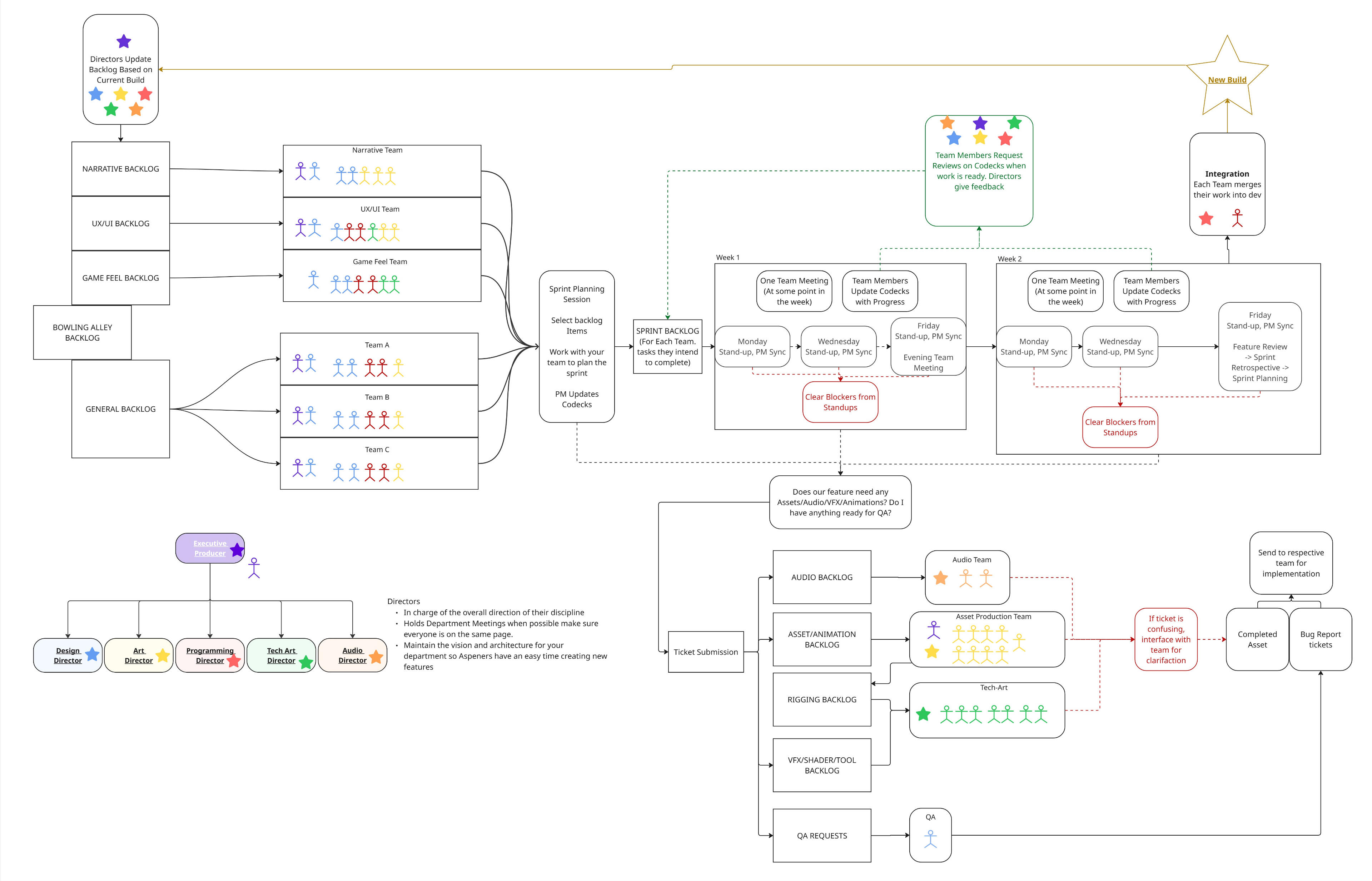 Studio Aspen 2024 struggled with communication silos and lack of ownership. Developers felt disconnected from the larger vision, and cross-department coordination was chaotic.