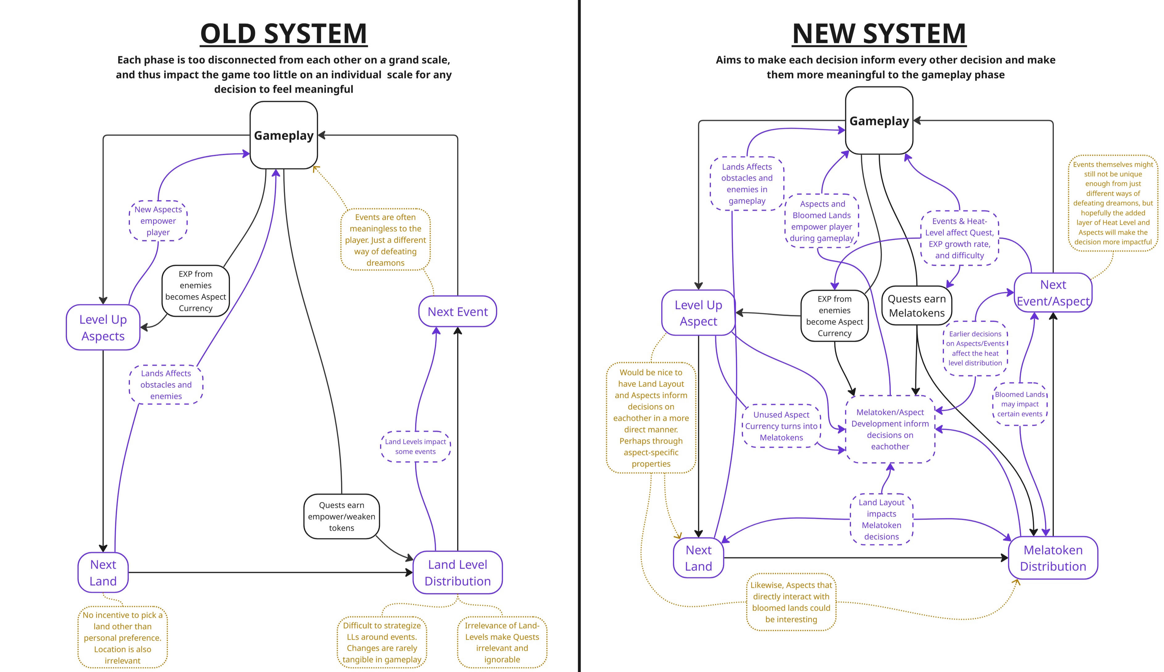 When facing design problems, I use Miro boards to map out entire systems visually. I document all mechanics, player actions, game states, and their interconnections to identify where systems break down.For Kleptomancy, I mapped out the original open-ended puzzle design and discovered players could find degenerate strategies that trivialized all challenge. The flaw wasn't in execution, it was fundamental to the concept.For Dreamscape's progression system, I created flowcharts comparing the old disconnected structure versus a proposed integrated system where each decision informed others. This visualization helped the team understand why players felt their choices lacked weight.